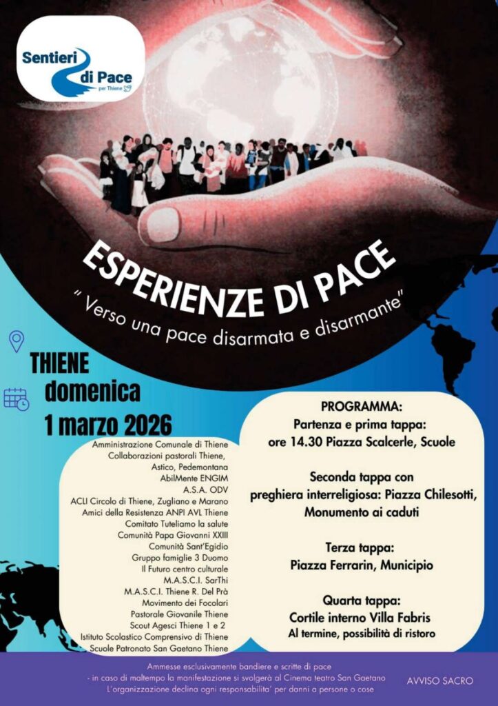 Notiziario settimanale Marcia della Pace – 1 marzo 2026 di Lucio Fabbian|Pubblicato 27 Febbraio 2026 Condividi: Condividi su Facebook (Si apre in una nuova finestra) Facebook Condividi su WhatsApp (Si apre in una nuova finestra) WhatsApp Invia un link a un amico via e-mail (Si apre in una nuova finestra) E-mail Stampa (Si apre in una nuova finestra) Stampa